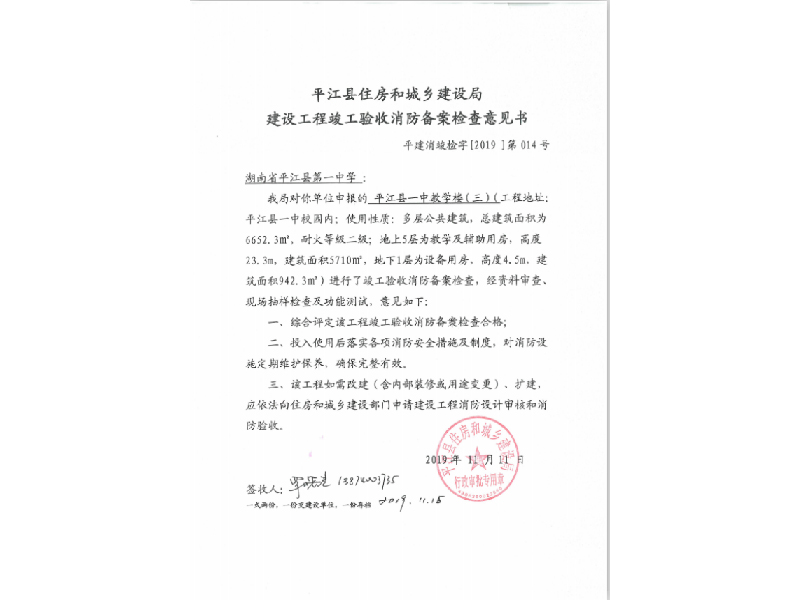 平江縣第一中學(xué),平江縣住房和城鄉(xiāng)建設(shè)局建設(shè)工程竣工驗收消防備案檢查意見書